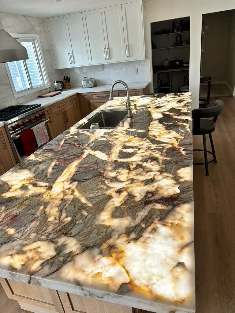 Custom countertops are templated after cabinets are installed, so measurements account for any variance in wall alignment or cabinet depth. The fabricator cuts the material to fit your sink, cooktop, and faucet precisely, and the installer seams sections together with color-matched epoxy if your layout requires multiple pieces. You end up with a surface that sits level, drains properly, and integrates with backsplashes and cabinetry without visible misalignment.